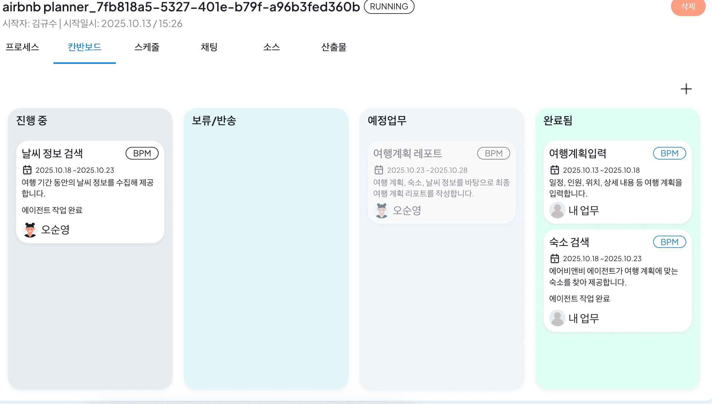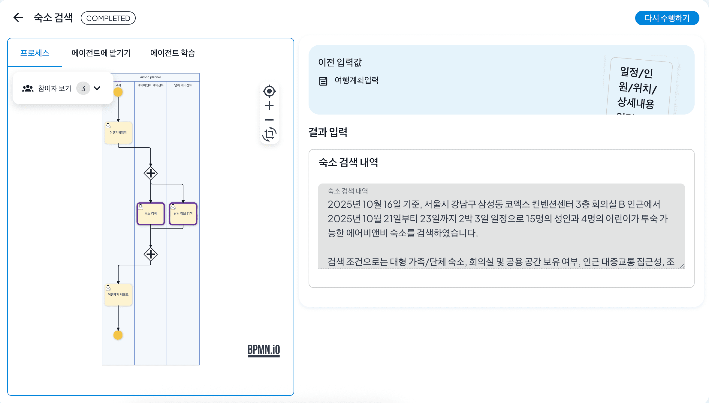 재작업 범위 설정이 완료되면 워크아이템이 새로 생성되며 이전에 에이전트를 통해 진행됐던 숙소 검색이 보상처리로인해 롤백되어 다시 작업이 진행되는것을 확인할 수 있습니다.