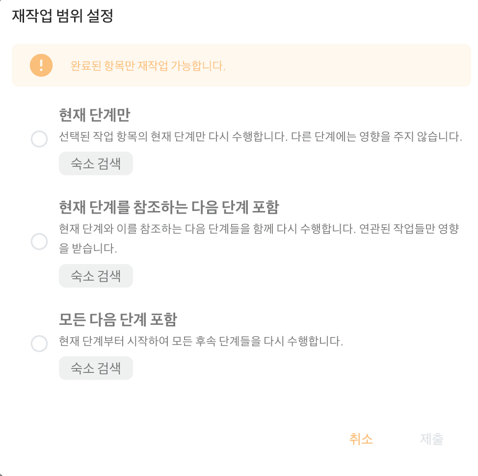 숙소 검색 단계 우측 상단에 위치한 다시 수행하기를 클릭하면 아래와 같이 재작업 범위를 설정할 수 있습니다.